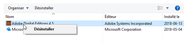 - Dans la fenêtre qui apparaît, faites encore un clic droit sur Adobe Digital Editions et sélectionner Désinstaller.