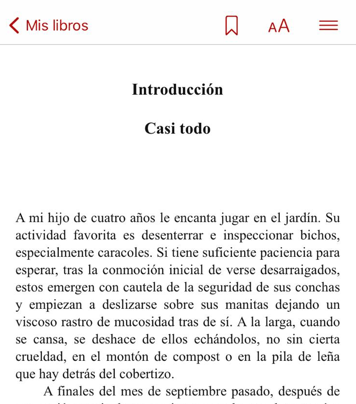 Premendo no centro da páxina amósase un menú con opcións de configuración do texto, acceso ao índice de contidos e ao marcapáxinas.